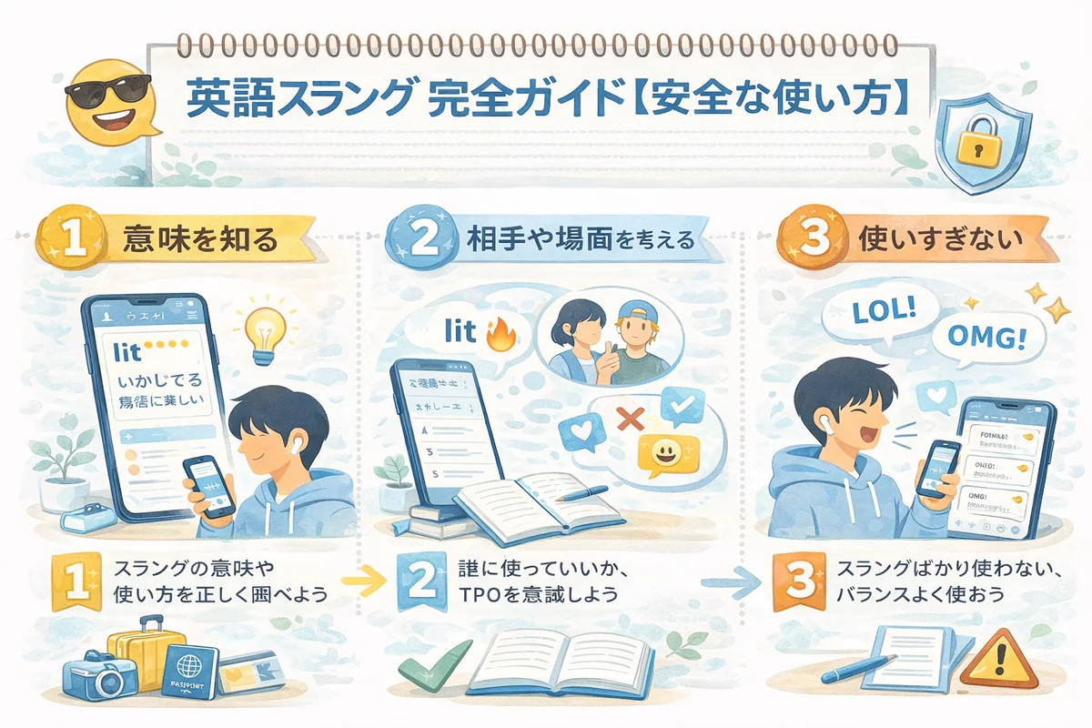 多くのスラングは、日本語でいう「やばい」のように、文脈でポジティブにもネガティブにもなります。最初は無理に直訳しようとせず、「この場面では『めっちゃ○○』ぐらいの強い感情だな」とイメージでつかむと覚えやすくなります。