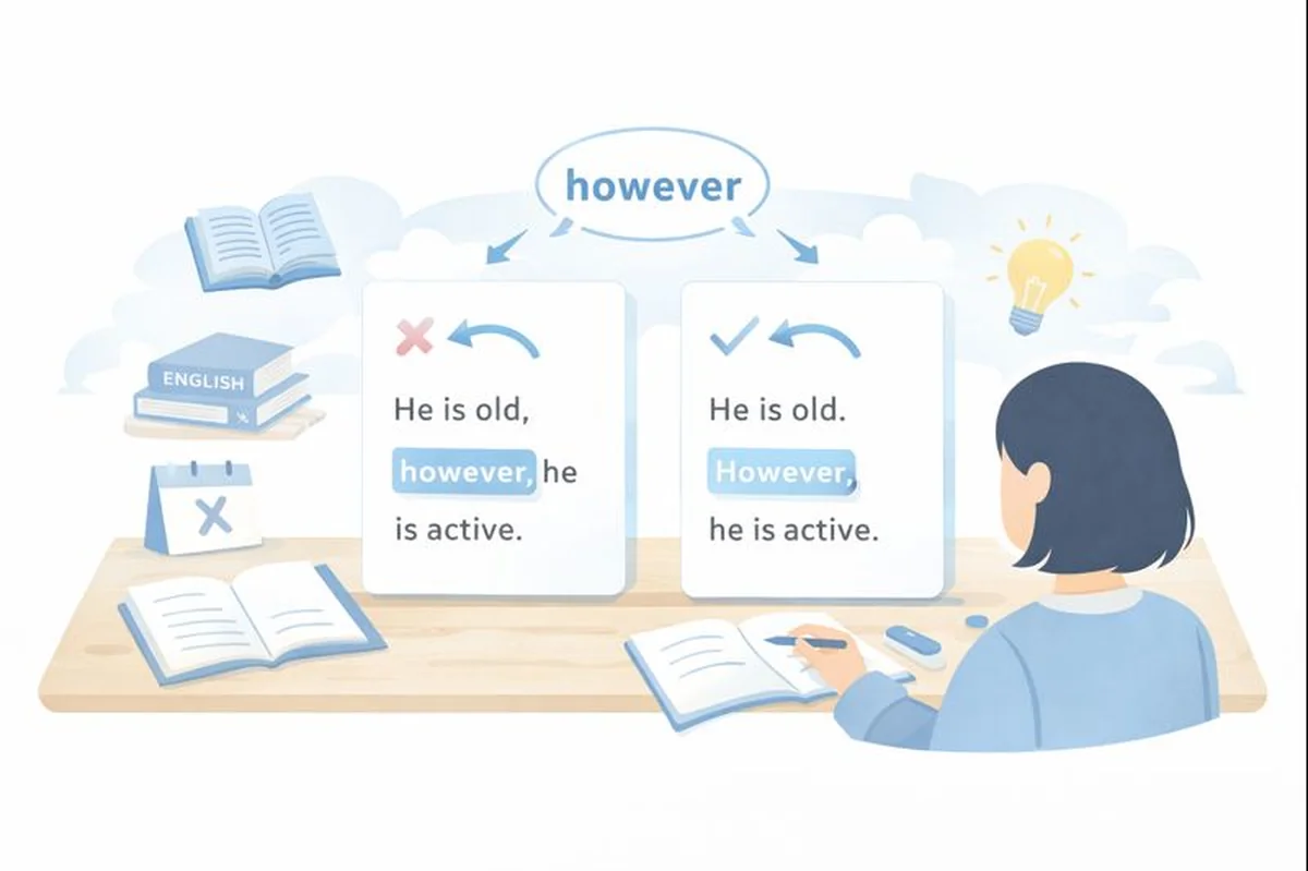次に、もっともよく使う「しかし」の however の位置とカンマのルールを整理します。